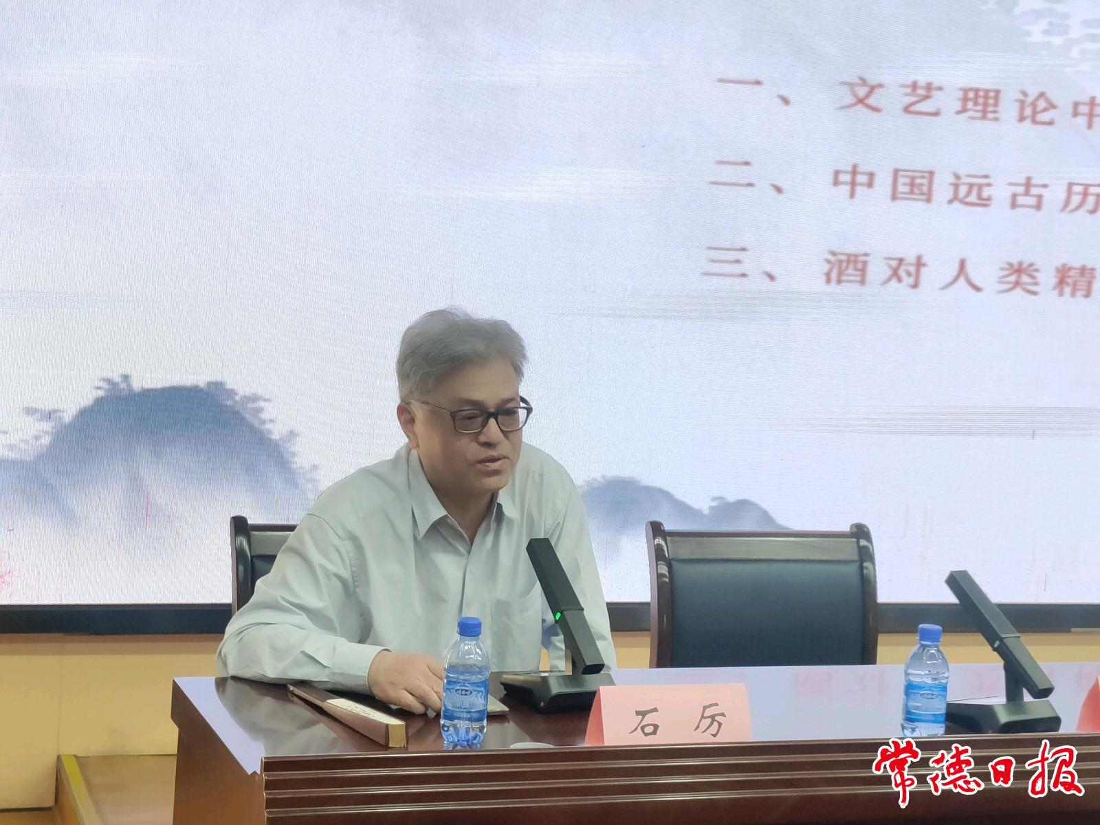 此次活动由中国丁玲研究会、常德丁玲文学创作促进会、湖南文理学院文史与法学院联合主办,活动特邀诗人、文史学者、《中华辞赋》杂志总编辑、《诗刊》编委石厉担任主讲嘉宾。石厉以陶渊明的《饮酒二十首》和李白的《将进酒》为例,深入阐释了“诗歌与酒神精神”的内在联系。他指出,酒神精神在诗歌创作中具有独特的象征意义,它不仅体现了诗人对自由、激情与生命力的追求,更是一种超越现实、追求精神解放的艺术表达。石厉的讲解深入浅出,既有理论深度,又结合了具体的诗歌作品,引发了现场观众的强烈共鸣。部分诗人表示,聆听报告后,加深了对“诗歌与酒神精神”的理解,也进一步拓宽了文学创作的视野与思路。