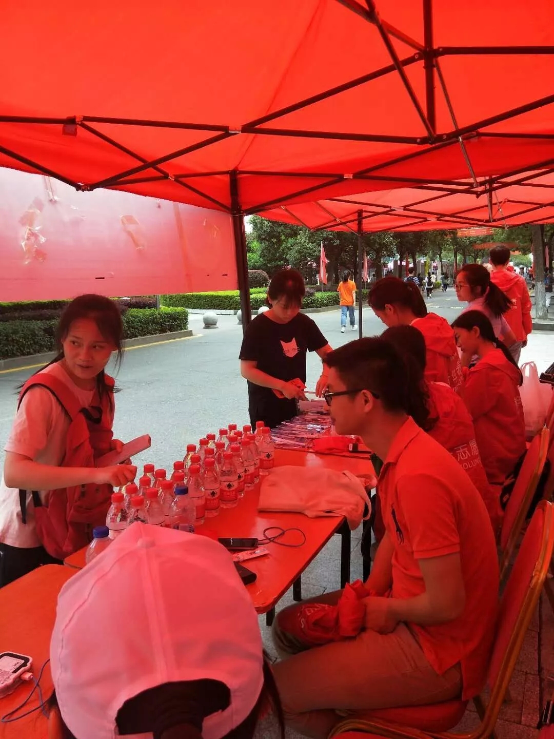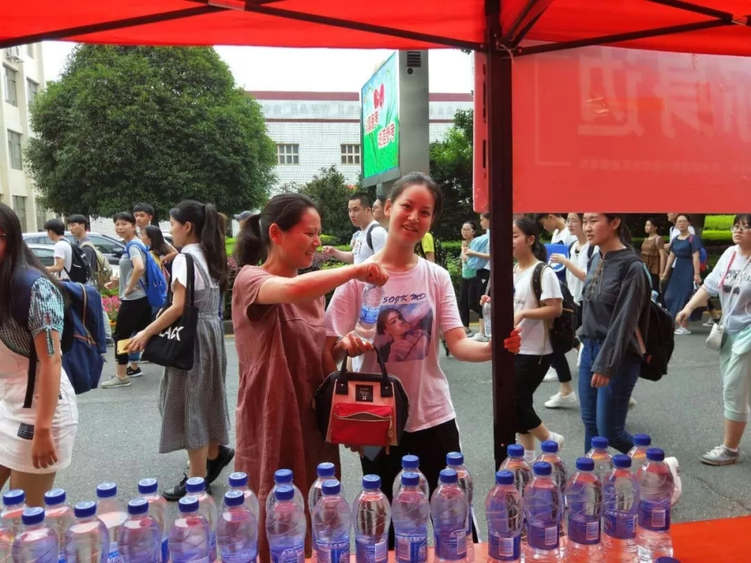 六月明媚的天气,微风不燥。志愿者们早上七点从学校出发,由校团委老师带队分别去市一中、七中和六中为高考考生分发水,考试工具。