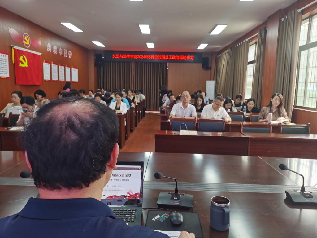 (通讯员:申雷)2024年5月21日下午,文史与法学学院组织召开了2024年5月的全体教职员工政治理论学习。学院党委书记王翀主持,学院党委委员和全体教职员工参加会议。
