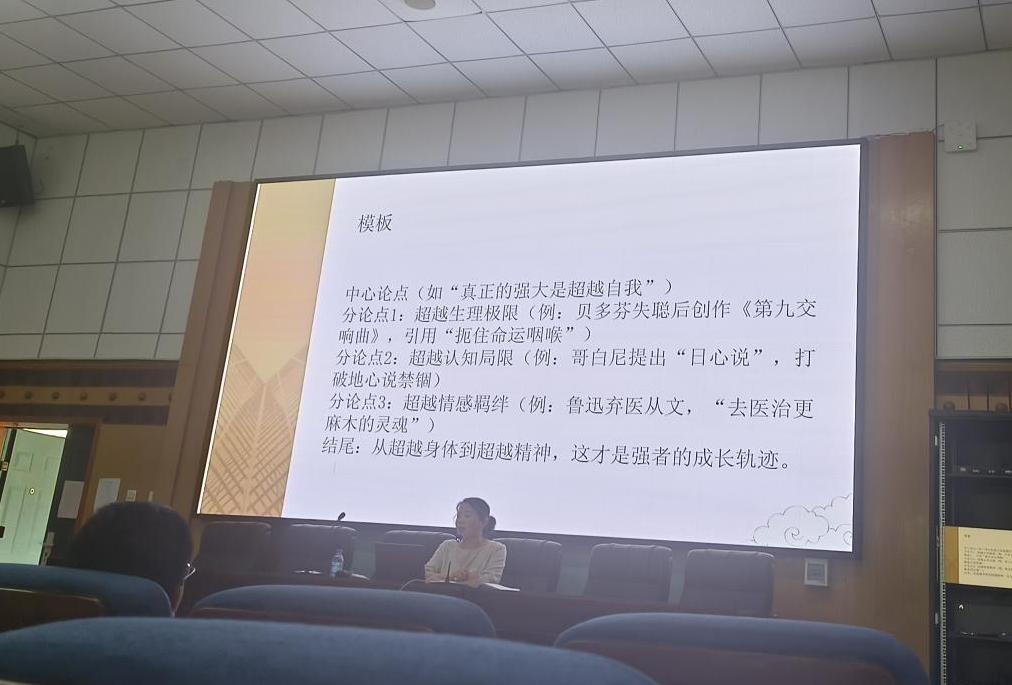 活动伊始,汪琼老师以 “话题作文写作指导”为核心,结合部编版教材中邓稼先、阿长等人物案例,强调“以小见大”的写作理念。她系统拆解审题、立意等六大写作要素,提出“抓关键词句”“破译话题内涵”等策略,以《我身边的小人物》《青春》为例,演示“糖葫芦式结构”“悬念反转式结构”的运用技巧,并结合《2024年湖南省初中学业水平考试作文评分标准》,解析一类卷 “立意深刻、情感真挚”的评分要点,其部级优课《尺水微澜意悠长》的教学理念贯穿全程,让在场师生深受启发。