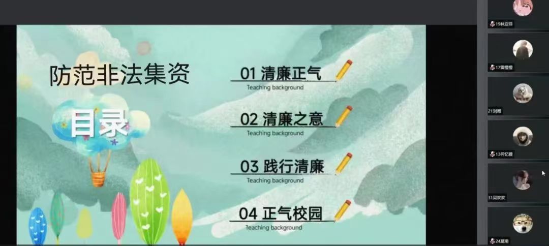 本次班会在线上进行,由各班团支书组织推进,班会上进行了相关材料的展示和有关内容的讲述,向同学们普及了防范非法集资的基础知识;会后也及时总结,做好防范非法集资安全教育的落实工作,保障了工作实效。通过这次“防范非法集资”安全主题教育班会,提高了学生对非法集资的风险防范意识,做好了“两节”期间防范非法集资宣传教育,提升了防范能力,降低安全风险隐患,利于净化校园环境。