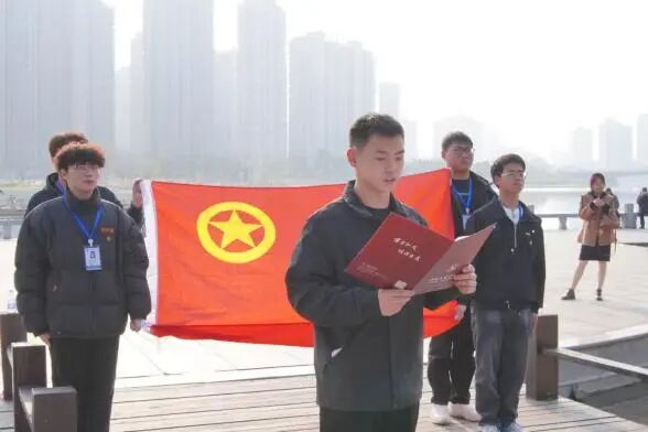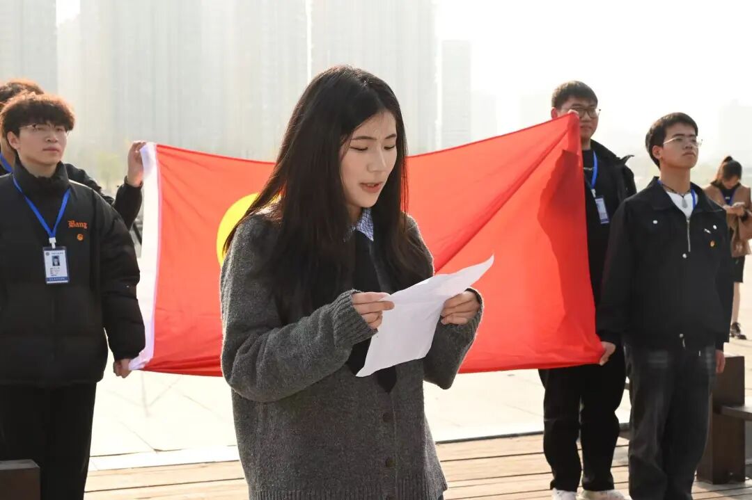 在领誓人汪童同学的带领下,新团员们全体肃立,面向鲜艳的团旗举起右拳,字字铿锵地许下入团誓言,坚定的声音久久回荡。仪式现场,新团员代表吴瑞涵同学结合河街的历史底蕴畅谈入团心声,优秀团员代表张家毓同学则从自身成长经历出发,分享了在河街文化浸润下的青春感悟。