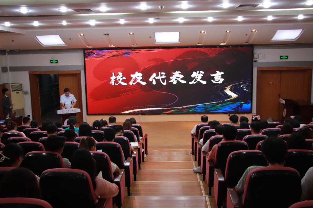 博集法科律师事务所代表徐超上台发言,他表达了自己对母校感恩和怀念并对文法学子提出三点建议:勤学、实干、坚持,他表示,希望同学们能够珍惜今天的条件,牢记历史的使命,刻苦学习,全面发展,为祖国、为民族做贡献。