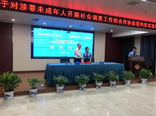 鼎城区检察院党组书记、检察长朱艳哲与湖南文理学院文史与法学学院党委书记、院长王翀共同签订“关于对涉罪未成年人开展社会调查工作的合作协议”。