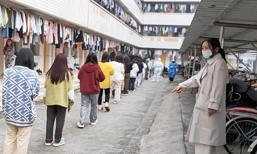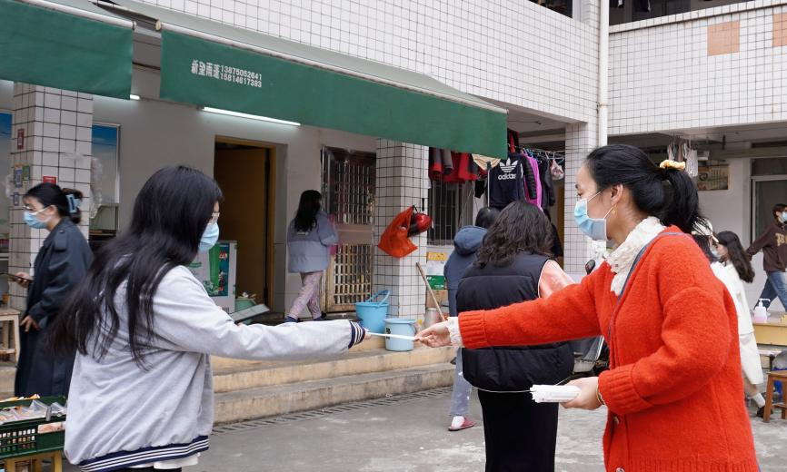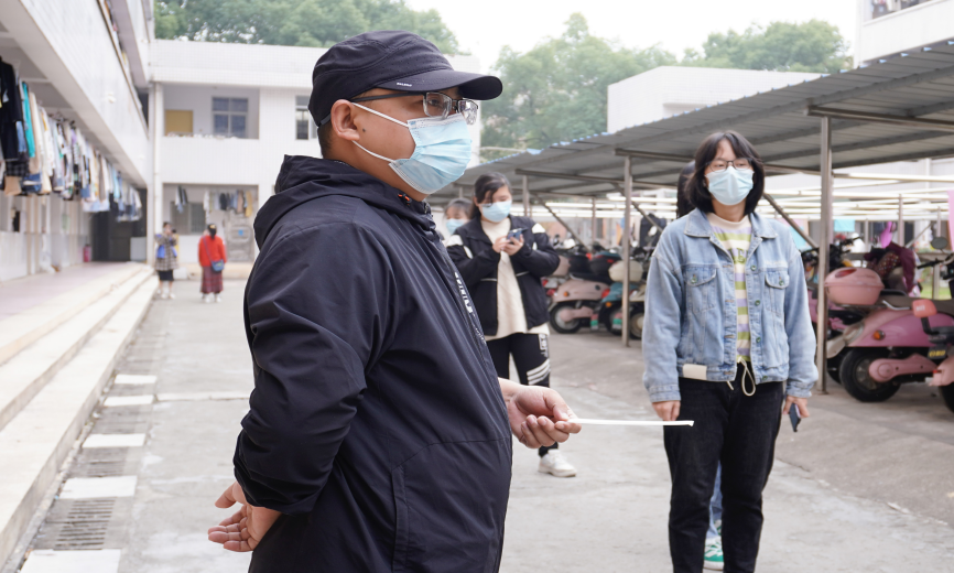 检测现场,同学们按批次分楼层排队进行核酸采集,规范佩戴口罩并自觉保持一米间隔,采集过程井然有序。四位教师志愿者分工明确,在队伍两旁协助现场信息采集和秩序引导工作,并为同学们分发口咽拭子。在医务人员的高效工作和同学们的积极配合下,核酸采集工作顺利完成。“这次的志愿者经历尤为难忘,让我见证了疫情下的‘文法力量’。我们的学生志愿者,热心、尽心,有这样的青年助力,抗疫胜利将是必然和唯一的结果。”郑栋辉说。