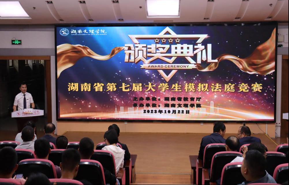 教务处处长兼生命与环境科学学院院长王云主持颁奖典礼。评委会主席、湖南省检察院三级高级检察官陈华英对参赛选手的法律文书写作、法律条文应用、语言表达、临场反应、团队协作能力等给予了精彩点评。湖南省教育厅高教处副处长王荣,湖南省人民检察院二级高级检察官唐求夫,湖南省高级人民法院二级高级法官伍胜,常德市中级人民法院党组书记、院长张经伟,常德市人民检察院副检察长郑朝兵,常德市司法局局长孙权新,常德仲裁委副秘书长李承芳,中国人民银行常德市分行副行长黄小雄,优秀校友、粤旺集团董事长万俊华,校党委副书记、校长刘宇文,校党委委员、副校长兼文史与法学学院院长晏昱等领导、嘉宾出席颁奖典礼并为获奖队伍、选手及指导老师颁奖。