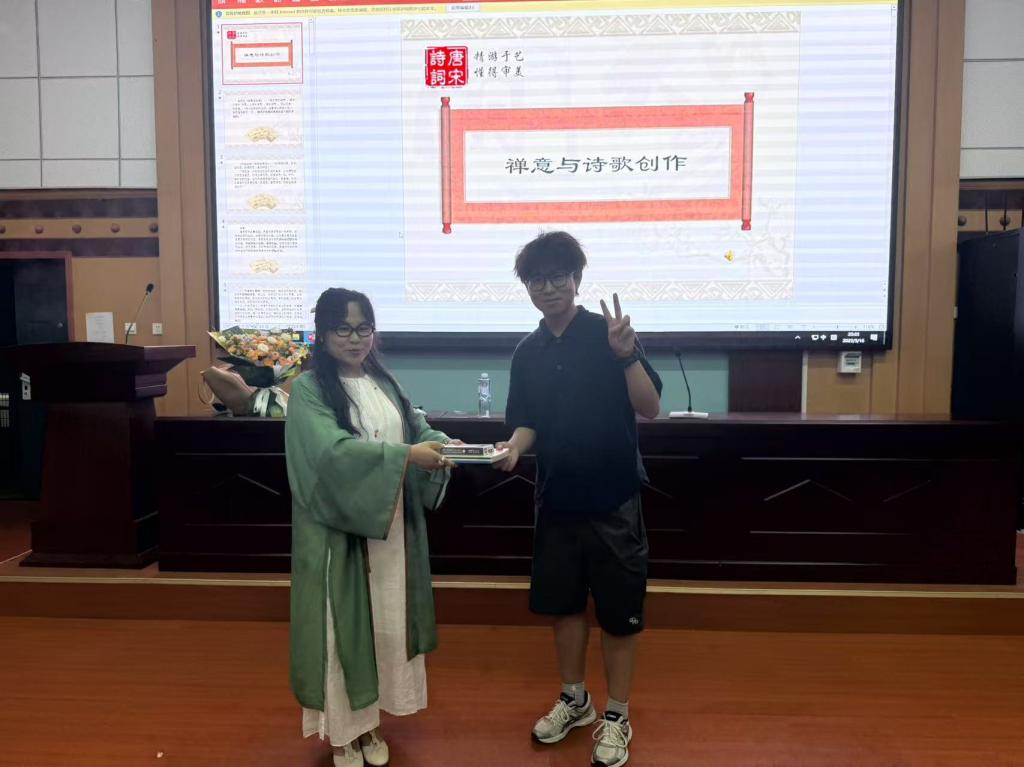 2025年5月16日由文史与法学学院主办、兰芷文学社承办的以“荷花的升起”为主题的禅意与诗歌创作讲座在T3C307顺利进行。此次活动吸引了一百余名对文学、禅意、创作感兴趣的汉语言文学专业同学参加。
