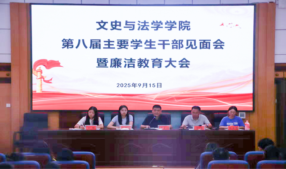 为凝聚新一届学生干部力量,明确责任使命,增强廉洁自律意识,推动学院学生工作有序开展,2025年9月15日中午,文法学院在第三教学楼C307教室召开第八届主要学生干部见面会暨廉洁教育大会。学院党委副书记周永明、学工办主任申雷、全体辅导员、第八届党务干事、主席团及各部门成员参加会议。会议由自律分会副主席张家毓主持。